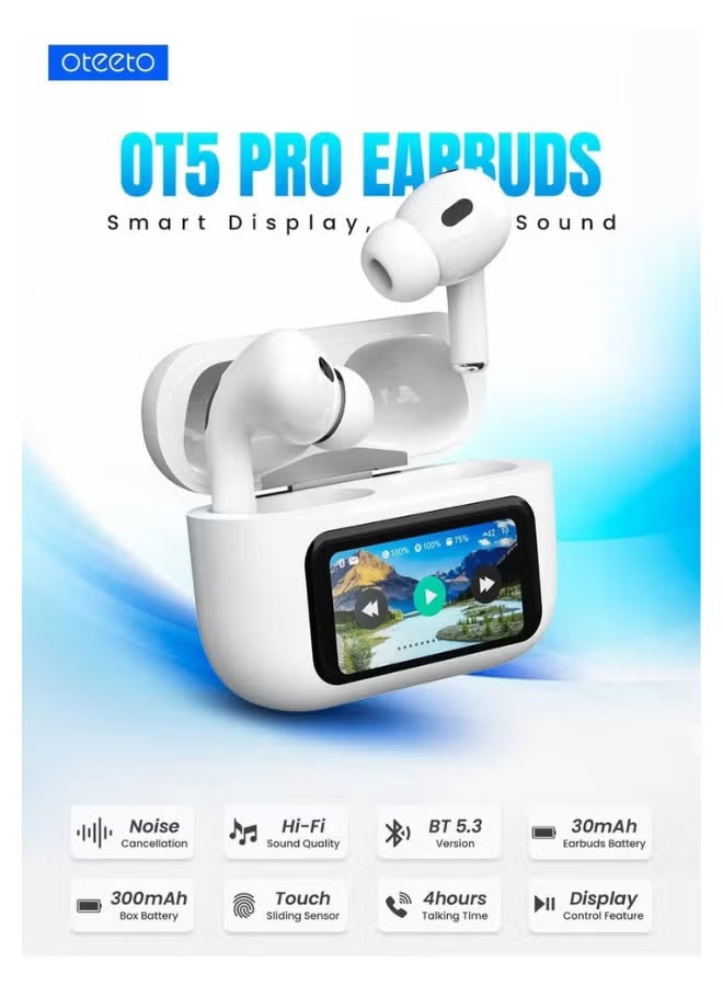 Oteeto OT5 Pro Wireless Earbuds - Smart Diplay Hi-Fi Sound Quality - Noise Cancellation Designed For iPhones and iPads - White